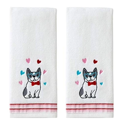 Includes 2 hand towels Soft cotton velour construction Cute corgi and heart embroidery with red and pink striped trim 100% Cotton 16" x 25"