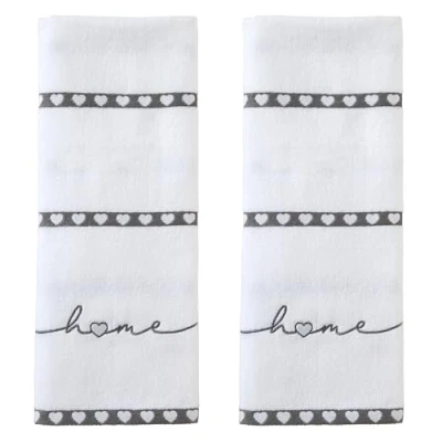 Includes 2 hand towels Soft cotton velour with heart stripes and "home" embroidery Can be used in the bath or kitchen, and makes a great gift! 100% Cotton 16" x 28" Machine wash Imported SKL Home brought to you by Saturday Knight Ltd., a leader for 40+ years in the home décor industry