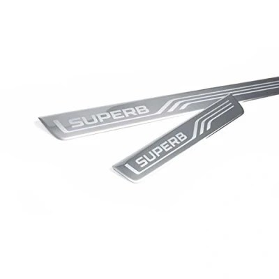 Original Skoda door sill plates, set of 4. 100% Skoda original accessory. Design: with Superb lettering on the front and back strips, mounting: self-adhesive back coating, material: stainless steel with polished surface, colour: silver. Box contents: 1 set = 2 x front strips, 2 x rear strips and assembly instructions (English language not guaranteed). Suitable for Skoda Superb III (Type 3V) from 2015.