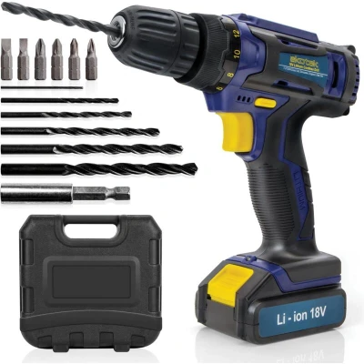 Skotek Cordless Drill Driver 18V Lithium Ion, 13Pc Electric Screwdriver Set, LED Work Light, Quick Change Power Battery with Charger & Carry Case Included