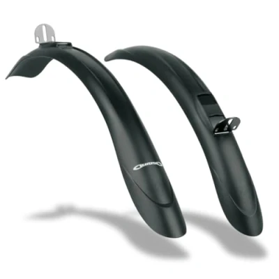 Impact resistant mudguards, front and rear in black. Snap-on mudguard set. Also suitable for suspension forks. Wheel Size: 26", 27.5" (650b), 28". Weight: 211g.