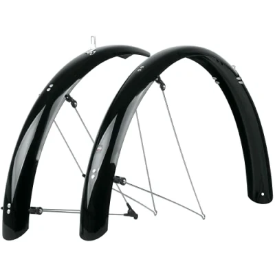 Optimal protection on every tour: whether on field or forest paths, the BLUEMELS SHINY bicycle mudguard set offers excellent splash protection for your bike thanks to the tyre mounting. Innovative bicycle accessories: thanks to the sandwich construction, in which ultra-fine aluminium strips have been embedded in a plastic coating, the splash guard is extremely robust and bend-resistant. THOUGHTFUL SAFETY SYSTEM The ASR safety system ensures easy decoupling of the struts when branches get between the mudguard and the front wheel so that the wheel does not block. Made in Germany: The BLUEMELS SHINY 28 inch black 65 mm mudguard set as well as almost all products from SKS GERMANY are made in Germany and offer a convincing proof of quality. Box contents: SKS GERMANY BLUEMELS SHINY 28 inch black 65 mm mudguard set, bicycle accessories made of robust sandwich construction (corrosion-protected, near tyre mounting, with ASR safety system), black