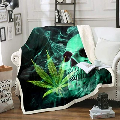 Skull Skeleton Design Fleece Throw Blanket Cannabis Leaf Sherpa Kids Boys Gothic Bones Green Smog Comforter Cover Marijuana Weed Fuzzy for Sofa Bed,Baby 30x40 Inch