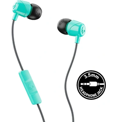 The Skullcandy Jib In Ear Earphones with Microphone (Miami Teal) offer dynamic audio with enhanced bass, a noise-isolating fit, and easy call/music controls via a 3.5mm jack—ideal for clear calls and comfortable music listening on the go. Includes two sizes of silicone ear gels for a secure fit.