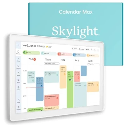 27" TOUCHSCREEN FAMILY CALENDAR: Meet the Skylight Calendar Max—our largest and most vibrant smart calendar yet. This stunning 27-inch HD touchscreen display auto-adjusts in portrait or landscape, keeping your family’s schedule front and center in any space. EFFORTLESS SYNCING WITH ALL CALENDARS: Connect to Wi-Fi and sync instantly with Google, Apple, Outlook, Yahoo, and Cozi. This digital wall calendar auto-syncs events from all your devices—no manual updates needed. CHORE CHART & DAILY PLANNER IN ONE: Assign chores, track tasks, and organize routines with a built-in digital planner designed to support independence and shared responsibility. Great for kids and parents alike. UPDATE ANYTIME, FROM ANYWHERE: Use the free Skylight mobile app to edit your calendar on the go. With the optional Plus Plan, unlock premium features like Magic Import, photo screensaver, meal planning, and stars & rewards. MODERN DESIGN, EASY TO INSTALL: Mounts in portrait or landscape with an included guide. Swappable frame styles let you match your home’s decor—perfect for kitchens, entryways, or command centers.