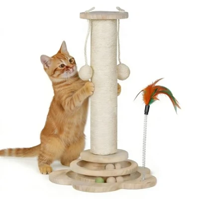 【Perfect Size for Cats】-- Measuring 28×28×45 cm with a 7 cm diameter sisal post and 1.5 cm thick wooden panels, this compact cat scratching post is ideal for kittens and small cats, fitting easily in any indoor space. 【Premium Natural Materials】-- Crafted with 100% sisal rope and a sturdy pinewood base, the sisal cat scratcher is durable, safe, and stable. The natural texture of sisal satisfies your cat’s scratching instincts while protecting your furniture. 【Multi-Functional Play & Rest】-- Featuring an integrated scratching post, climbing area, and top rest platform, this kitten scratching post keeps your feline active and engaged. Includes a spring feather toy, 2 catnip balls, and 4 wooden balls for interactive play. 【Stable, Anti-Tip Design】-- Wide, weighted base and reinforced construction ensure stability, preventing tipping during energetic play. Perfectly safe for playful kittens or small cats, letting them scratch, climb, and relax confidently on this cat scratcher post. 【Easy Assembly & Stylish Finish】 Quick, tool-free setup with included screws and instructions. Natural wood finish complements any home decor while providing cats a dedicated area to play, climb, and rest.