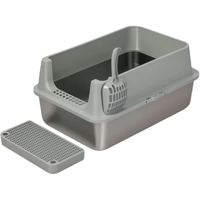 Description Designed with practicality and comfort in mind, the Skylos litter box offers a premium toileting solution for large cats and multi-cat households. With its extra-large capacity and smart structure, this cat litter box easily supports daily use while keeping your home cleaner and fresher. The Skylos stainless steel cat litter box features a spacious 60 x 40 x 30cm body, capable of holding up to 30–32L of litter. This makes it an ideal large cat litter box for adult cats, reducing the need for frequent refills and maintenance. The deep 15cm basin and reinforced high sides effectively minimise splashing and litter scatter, making it a reliable high sided cat litter box for male or active cats. Crafted from durable stainless steel and ABS plastic, this Skylos large cat litter tray resists odours, rust, scratches and chewing, ensuring long-term hygiene and easy cleaning. The semi-enclosed design promotes airflow to help maintain a fresher environment, while the front-low,