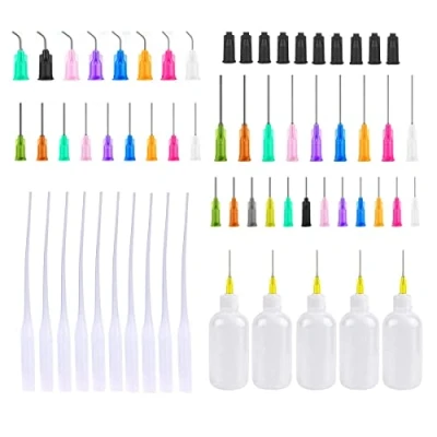 【Material】- These applicator bottles are made of translucent soft flexible plastic, easy to squeeze, non-toxic and odorless. 【Feature】- These applicator bottles are small size and light weight, and can be carried around after fixing the tip cap. Resuable, easy to use and squeeze, washable. The syringe caps can well prevent the liquid from drying out or leaking. Great for lab dispensing and other projects that require small drops or fine lines of glue. 【Excellent Precision Tool】- Needles and plastic bottles can be freely removed - loaded. The nib is very delicate and accurately control the volume that press out. The multi-colored tips help you distinguish different glues and liquids. 【Multiple Function】- These dispensing bottle, for Wood Glue, Glues, Adhesives, Light Oil, Great tools set for essential oil, science lab, flat back rhinestones, hobby crafts, home or industrial precison applications of glues, inks, perfume, lubricants, sealants, children making DIY handcraft and painting etc. 【Package Included】- 5pcs 30ml applicator bottles; 5pcs Black Syringe caps and 5pcs glue nozzles; 10pcs 1.5 inch plastic steel dispensing heads; 10pcs 1 inch plastic steel dispensing heads; 10pcs 0.5 inch plastic steel dispensing heads; 9pcs 0.5 inch elbow dispensing heads. Total 54pcs, good for distinguish.