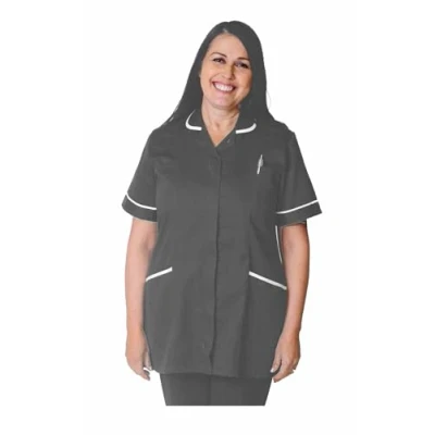 Skywear T66 Healthcare and Beauty Tunics Woman Girls Ladies Tops Office Uniform Shirts, Black with White Trim, Size 12