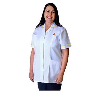 Skywear T66 Healthcare and Beauty Tunics Woman Girls Ladies Tops Office Uniform Shirts, White with Yellow Trim, 12