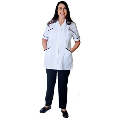 Designed for Professionals – Tailored for healthcare, beauty, office, salon, and spa environments. These ladies tunic tops blend functionality with modern style for women on the go Premium Fabric for Comfort – Crafted from 65% polyester and 35% cotton, this breathable, durable tunic top ensures day-long comfort during long shifts. Easy to wash and maintain Elegant & Practical Design – Features a concealed step-in zipper with pearl press stud fastening, pleated back for a flattering fit, and stylish V-cut cuff detailing Functional Pockets – Includes two inset breast pockets lined with PU liquid-repellent fabric and two hip pockets for secure storage of essentials like pens or tools Smart Contrast Finish – Sharp contrast trim on collar, cuffs, and pockets adds a polished, professional look—ideal for nurses, carers, beauticians, and office teams