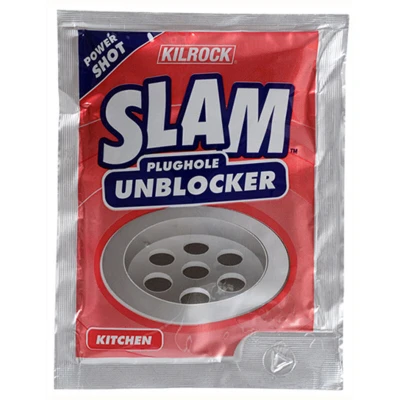 SLAM Plughole Unblocker dissolves fat, grease and food. Quickly clears kitchen plugholes and pipes. Stops slow draining water smelly sinks and kills germs.
