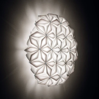 Unique La Vie ceiling light – inspired by the flower of life With its striking symbolism, the La Vie ceiling light is synonymous with energy and harmony – the light is inspired by the flower of life and captivates with its delicate, hand-bent elements. Numerous blossoms create an exciting pattern that produces equally exciting lighting effects. The Italian lighting manufacturer Slamp, based in Rome, stands for sustainability and uniqueness, which it has proven once again with this series of lights. The uniqueness of Slamp's creations comes from the use of high-quality, break-resistant technopolymers, from which patented, innovative materials have been developed. Lentiflex® and Opalflex® are used in La Vie. These are two highly flexible, durable and lightweight materials, the waste from which is recycled. The glass elements make the lampshade more transparent and shiny, giving the light a special effect. To ensure that the rather spot-like light can be generously diffused and produce comprehensive illumination, the individual plug connections have been bent and manufactured at a special angle of inclination. Thanks to the magnetic mount and the handmade plug connections, the use of screws and adhesives is avoided and the replacement of the bulbs (not included) and cleaning are made easier. La Vie can also be mounted as a wall light.