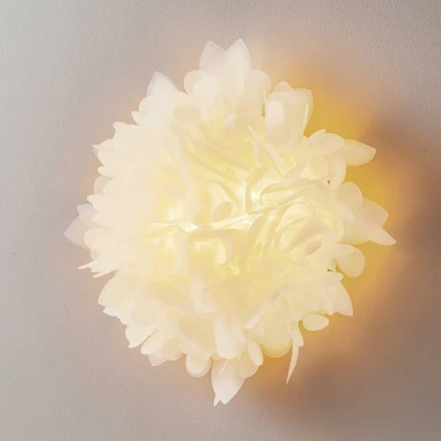 Sustainable and exclusive Veli wall light in white foliage finish This impressive and highly decorative designer wall light from the Veli series leaves a lasting impression. Its organic shape exudes a sense of vitality and allows the viewer to discover the light anew every day. Composed of over 200 plug connections, Veli is a true work of craftsmanship. The individual elements are shaped by hand and combined to form a three-dimensional body. They are made entirely from the patented Opalflex® plastic, which was developed by the Italian manufacturer Slamp itself. This plastic consists of technopolymers and glass crystals, which are extremely flexible and completely unbreakable. The material gives Veli an attractive, delicate contour, which achieves uniform light diffusion. The exciting lighting effects that appear around the wall lamp serve either as soft, general room lighting or provide accompanying light for a decorative accent. Thanks to the practical magnetic system, the lampshade can be easily removed for cleaning. The Rome-based manufacturer Slamp was founded in 1992 by Roberto Ziliani. One of its major long-term projects is dedicated to sustainability. The manufacture of the lights from technopolymers reduces environmental costs fourfold. Slamp does not use screws or adhesives; all residues are recycled or, since 2020, donated to companies that use the leftover material to make nesting boxes for bumblebees.