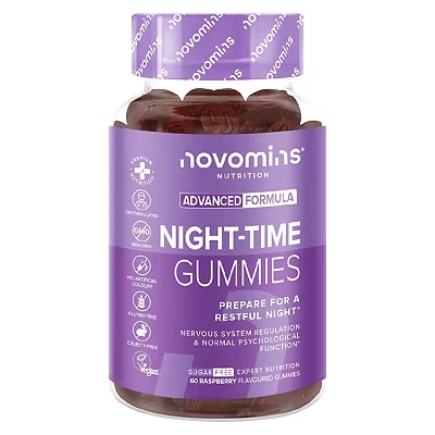 DELICIOUS SLEEP GUMMIES: Our NIGHT-TIME GUMMIES are a tasty raspberry-flavoured option designed for your bedtime routine. These vegan, NON-GMO, and halal sleep gummies are made with high-quality ingredients like magnesium and L-Theanine. Free from artificial colours and preservatives, they’re a clean, gentle choice. This product does not contain melatonin, melatonin gummies, melatonin tablets for sleeping, or other strong sleep aids often found in traditional sleep gummies for adults. WHY TAKE OUR NIGHT-TIME GUMMIES?: Quality rest supports overall wellness. Our NIGHT-TIME GUMMIES are made with magnesium, L-Theanine, Vitamin B12, B5, Glycine, L-Taurine, and Acerola Cherry Extract—ideal for evening routines. These vegan sleep gummies are designed for adults seeking a gentle, non-disruptive option. Unlike common sleep aids, sleep tablets, or other strong formulas, our sleep gummies for adults are created for everyday use with trusted, high-quality ingredients. SCIENTIFICALLY FORMULATED NIGHT-TIME SLEEP GUMMIES: Developed by doctors and nutritionists, our NIGHT-TIME GUMMIES are ideal for those who prefer not to swallow large sleep tablets or capsules. These vegan, gluten-free sleep gummies are designed for adults and teens alike. With calming ingredients like magnesium and L-Theanine, our sleep gummies for adults provide a gentle option compared to traditional sleep aids, making them easy to enjoy as part of your evening routine. A NATURAL EVENING OPTION: Our NIGHT-TIME GUMMIES include magnesium, Vitamin B12, and Biotin—nutrients known to support normal psychological and nervous system function as part of a balanced lifestyle. These gentle sleep gummies are a great addition to a calming bedtime routine. Free from artificial colours and preservatives, they offer a relaxing alternative to strong sleep aids, sleep tablets, or other intense options. Ideal for those seeking clean sleep gummies for adults. WHY NOVOMINS NIGHT-TIME SLEEP GUMMIES: At Novomins, we focus on quality, safety, and transparency. Our NIGHT-TIME GUMMIES are made with carefully sourced ingredients and produced to GMP standards. These vegan, gluten-free sleep gummies are designed for those seeking a gentle addition to their nightly routine. Unlike harsh sleep aids, sleep tablets, or overly strong formulas, our sleep gummies for adults offer a clean, trusted option.