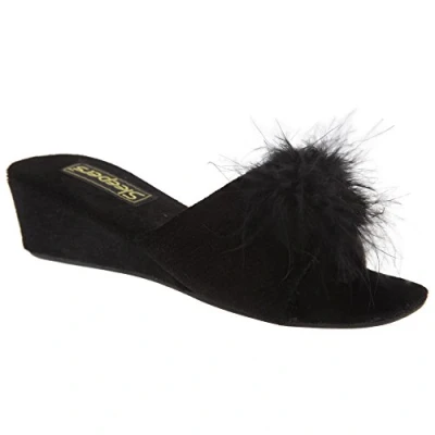 AmazonLadies wedge mule slippers Super light weight Textile covered wedge sole Velour upper Faux leather trim