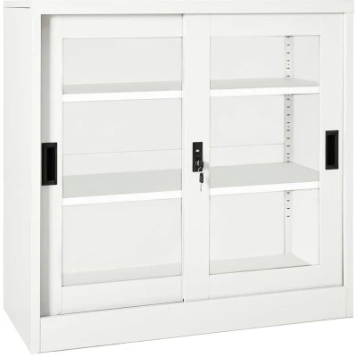 General description Remove all your clutter in the office with this sliding door cabinet! Made of steel and tempered glass, this storage cabinet is exceptionally sturdy and durable. The sliding door ensures smooth opening and closing, making it ideal for rooms with limited space where swinging doors are not an option. With 2 adjustable shelves, it is suitable for storing files of different sizes and features a lock to protect your personal documents from unwanted access. Technical specifications Colour: White Material: Steel, tempered glass Dimensions: 90 x 40 x 90 cm (W x D x H) Features sliding doors 2 adjustable shelves Loading capacity per shelf: 30 kg Total loading capacity: 60 kg Assembly required: Yes WARNING: In order to prevent overturning, this product must be used with the wall attachment device provided. Other information More details about preventing your furniture from tipping over can be found here .