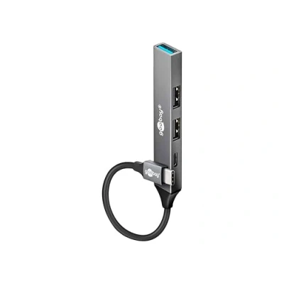 USB C HUB 3.2 is equipped with 4 additional USB ports to extend a USB C device with additional ports thanks to USB distributor Thanks to the slim design, the Multiport Hub fits practically in any bag and is indispensable on the go or when travelling The 3.2 USB C dongle supports up to 5 Gbps via the remaining three inputs with USB 2.0 each up to 480 Mbit/s High compatibility with the goobay USB-C to USB-A hub / for devices such as smartphone, keyboard, mouse, webcam, external hard drive and headsets without installing drivers Robust aluminium housing with multiple USB connector ensures particularly high durability of the little companion
