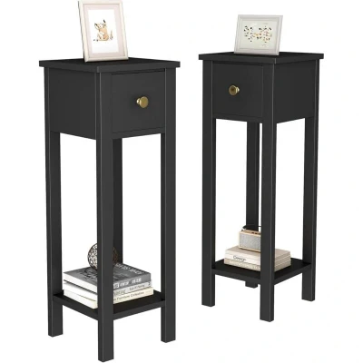 Slim Solid Wooden Bedside Table, Set of 2 Small Narrow Side End Tables, Modern Bedroom Nightstand with Open Shelf and Drawer for Bedroom,