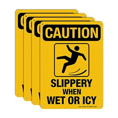 Slippery When Wet Or ICY Sign, Caution 4 Pack, 10" x 7" Rust Free .040 Aluminum, UV Protected, Waterproof, Weatherproof and Fade Resistant, Pre drilled Holes