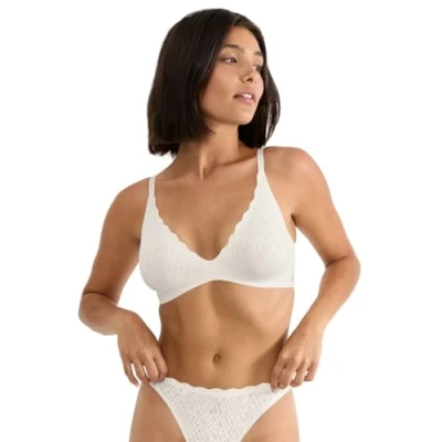 The great feeling of Zero Feel! Incredibly light, with total, 360° stretch, Sloggi’s Zero Feel Bliss The UP P Bra gives you all the lift and support of a push up bra, but without uncomfortable wires, seams or labels. In a graphic stretch lace fabric, with a contrasting smooth, super-fine microfibre layer beneath, these bras look fabulous and feel even better. Offering superb freedom of movement and breathability, thanks to the full stretch microfibre (made with recycled polyamide), these bras fit like a second skin, assembled using flat, free-cut edges and pinch-free dot bonding instead of conventional stitched seams. Fully adjustable for a perfect fit, with a four-position hook-and-eye back strap, and adjustable shoulder straps. The specially shaped and cushioned push up ‘cookies’ that give you that enhanced silhouette are fully removable.