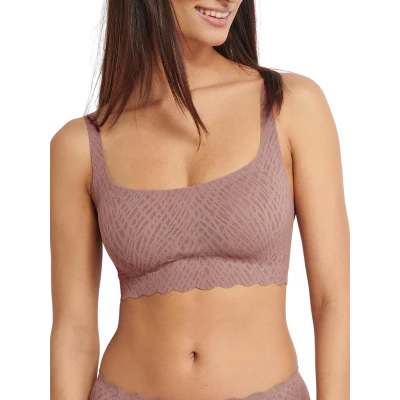 Sloggi ZERO Feel Bliss Top. Seamless and soft stretch fabric with a geometric mesh overlay. Full coverage neckline with wide straps and removable cup padding. Product is made of 76% GRS-certified recycled Polyamide and 24% Elastane and is machine washable.
