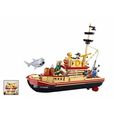 BUILDING SET: 592-piece whaling ship construction set featuring detailed vessel design with crew figures and accessories, suitable for ages 8-12 SIZE AND SCALE: Impressive 27.4 cm long model ship with realistic details including barrels, masts, and navigation equipment INTERACTIVE ELEMENTS: Dynamic play features including poseable figures, moveable parts, and a dramatic shark figure for enhanced storytelling DESIGN DETAILS: Authentic nautical aesthetics with tan and red colour scheme, named 'Catherine' with distinctive striped hull design EDUCATIONAL VALUE: Complex build process helps develop spatial awareness, fine motor skills, and following detailed instructions, Manufacturer: Sluban