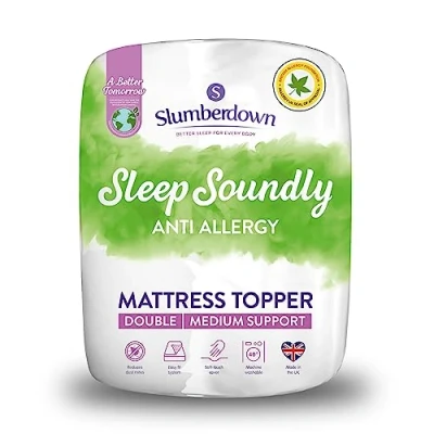 ManoManoAdd an extra layer of comfort to your bed and sleep soundly every night with this sumptuous Anti Allergy Mattress Topper from Slumberdown. Mattress toppers not only provide additional cushioning to support your body, they can also help to reduce tossing and turning, allowing you to sleep deeply. As well as helping to revive an old and tired mattress, a topper can breathe life into temporary sleeping arrangements such as a sofa bed or guest bed to provide lasting comfort. This Slumberdown Sleep Soundly Anti Allergy Mattress Topper has been created with comfort in mind: the soft touch cover encases a specially treated anti allergy hollowfibre filling that helps to reduce the build-up of dust mites and bacteria – it’s even endorsed by the experts at Allergy UK for extra peace of mind. This topper also features an anti-slip reverse; it grips to your mattress to stay securely in place without the need for fighting with elasticated straps or skirts! If you feel your mattress doesn’t offer
