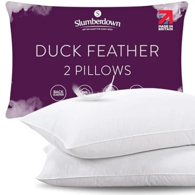 Ethical Natural Fill - Generously filled with ethically sourced 100% duck feathers, these medium firm pillows gives you the prefect balance of breathability and temperature regulation - so you can stay cosy and comfy without overheating. Natural Loft & Support - Duck feather fill naturally retain their loft far longer than synthetic fill. The pillow gently moulds to your head and neck, giving that “sink-in” feeling without losing support and flattening - ideal for back and side sleepers. Non-Allergenic Cotton Cover - Encased in a 100% cotton cover that’s naturally breathable and helps regulate your temperature. This bed pillow is made with materials that are unlikely to cause allergies - perfect for sensitive sleepers. 2-Year Quality Guarantee - Our bed pillows are made in the UK using feathers that are a natural byproduct of the food industry - never live-plucked. Backed by a full 2-year guarantee for lasting comfort and complete peace of mind. Easy Care - Slumberdown hotel quality pillows are easy to maintain. Simply pop your pillow in the wash at 40°C and tumble dry on low. They're made to stay fresh, lofty and comfortable - wash after wash.