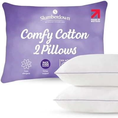 UNMATCHED COMFORT & SUPPORT: Experience restful nights with our firm pillows, designed with enhanced firmness to provide consistent support. These hotel pillows help maintain better neck and spine alignment - perfect for back & side sleepers or anyone needing extra lift. BOUNCE BACK & PLUMP: These hotel quality pillows are generously filled with super-soft springy fibres that stay plump and retain their shape night after night ensuring long-lasting comfort and support - no flattening or sagging over time. LUXURIOUS COTTON COVER: Wrapped in a premium, natural 100% cotton cover that is soft to the touch and gentle on skin - breathable, durable, and designed for a cool, crisp sleep experience every night for you and your family. 2-YEAR QUALITY GUARANTEE: Our bed pillows are are proudly made in the UK, supporting local craftsmanship and ensuring the highest level of quality and attention to detail. And we have got a solid 2-year guarantee to back it up! NON-ALLERGENIC: Slumberdown luxury pillows are made with premium materials that do not contain any materials which are likely to cause allergies. It helps you prevent symptoms like sneezing, runny nose, itchy skin or watery eyes.