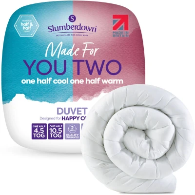 ManoManoSlumberdown Made For You Two dual tog duvet has been specially designed to help partners who prefer to sleep at different temperatures. This clever duvet has a cool side and cosy side that is reversible, making it easier to tailor your warmth level when sleeping. The 4.5 tog has a lightweight filling which keeps you feeling cool and comfy and the 10.5 tog has a cosy filling which keeps you feeling comfy and warm. So you and your partner can enjoy a restful night’s sleep without compromise, all night long.