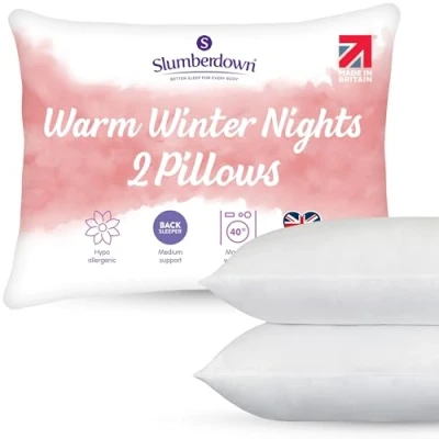 Slumberdown Warm Winter Nights Bed Pillows 2 Pack Breathable & Non Allergenic Medium Support Back Sleeper Pillow UK Made, Soft Touch Cover, Washable (48 x 74cm)