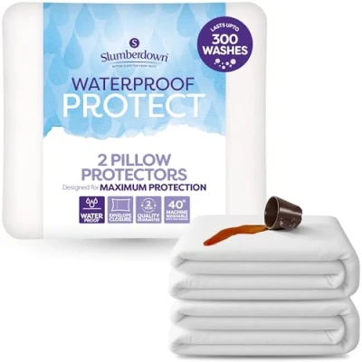 SUPER ABSORBENT & DURABLE - Designed with a waterproof fabric yet super absorbent barrier to block spills, drool, sweat, and more. Slumberdown pillow protector withstands up to 300 machine washes without losing protection or performance. SOFT & SILENT - No more noisy rustling. Our pillow covers are crafted with a smooth terry towelling surface that’s whisper-quiet, breathable and stays soft through every turn, ensuring an undisturbed rest for light sleepers and restless nights. FOR EVERYDAY ACCIDENTS - Whether it’s little ones, elderly family members needing extra care, or just everyday spills. This waterproof pillow protector protects and prolongs the life of your pillows from spills, stains and accidents. 2-YEAR GUARANTEE - Designed with comfort in mind, our water proof pillow protectors are made to the highest standards with exceptional attention to detail, and backed by a full 2-year guarantee for peace of mind. FITS UK STANDARD PILLOWS (50 x 75cm) - Designed to fit all UK standard size pillows (48 x 74cm), the envelope closure on this 50 x 75cm protector ensures a snug, shift-free fit that stays perfectly in place.