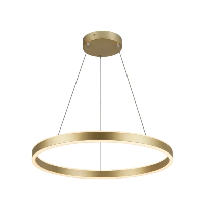 Top and bottom LED pendant light One 60 in brass This brass-coloured LED pendant light made of aluminium impresses with its elegant design. The body itself is ring-shaped and is reminiscent of a decorative ring, especially in this colour. Three fine, elegant wire cables, which can be shortened before installation, create the connection to the round canopy. The elegant look makes the pendant light a real eye-catcher for modern environments, whether in the living room, dining room or even in dining rooms and reception areas. Integrated LEDs on the top and bottom provide direct, wide-angle lighting that is also externally dimmable via the phase section. Before installation, the colour temperature can be set to 2,700 or 3,000 K using the CCT switch in the canopy.