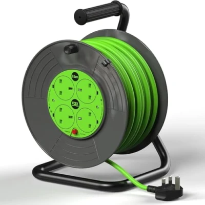 SLx Extension Lead 15m 4 Socket Open Cable Reel with Thermal Cut Out, Heavy Duty Long Reach for Garden, DIY and Workshop, 13A Fused UK Plug in Grey & Green