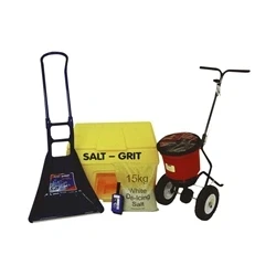 200 litre grit bin without hopper. 22kg salt spreader with a 3m spreading width. Hand scoop. 10 x 15kg bags of white de-icing salt. Suitable for use by smaller businesses.