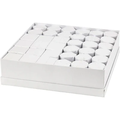 Assortment of card boxes in sets of 2 sizes in round, square and hexagonal designs - 36 pieces. Perfect for Summer camps, classes and youth groups these small boxes can be painted, decoupaged, used with coloured pend or many other colour mediums. Sizes between 4.5cm to 6cm and heights - 7cm to 9cm.