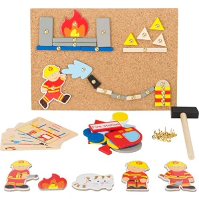 Hammer game with hammer, cork board and small wooden and cardboard parts to the motto fire brigade Promotes creativity, motor skills and safe handling of a hammer Ready to hand and well packaged in a hinged package with compartments Made of cork, wood and cardboard Size: 19 x 26 x 4,5 cm, Manufacturer: Small foot by Legler