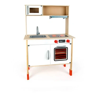 Numerous playing possibilities promise long play fun alone or in company With faucet, illuminated cooking plates at the push of a button, an oven and an extractor hood Made of solid plywood The stable feet are height-adjustable, Manufacturer: Small foot by Legler