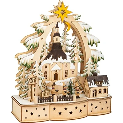 The Christmas decoration is made of filigree wood, decorated with detailed details and has indirect, battery-operated lighting The lamp has the outline of a Christmas tree and is reminiscent of a classic Christmas pyramid Thanks to the indirect lighting, the beautiful winter decoration creates a cosy light with the Christmas atmosphere