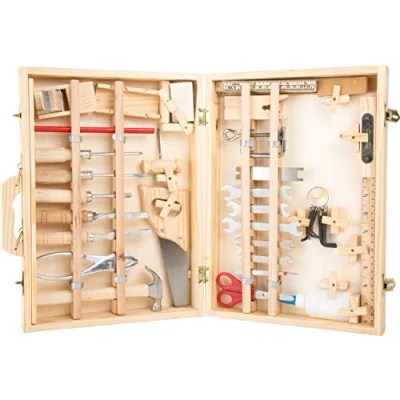 Large tool case with all kinds of accessories for children Incl. 48 tools and individual parts for small do-it-yourselfers Suitable for transport as all parts can be safely stowed in the case Made of robust wood and metal Size: 37 x 29 x 8,5 cm, Manufacturer: Legler