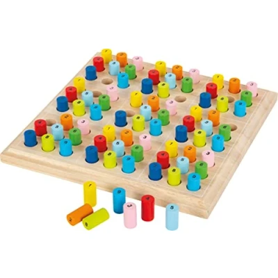 High quality beech wood board with coloured number pencils The colours of the pins are assigned to the individual numbers and thus promote the ability to remember. Nine fields with number combinations from 1-9 offer endless puzzle fun. Made of robust wood Size: 25 x 25 x 3 cm, Manufacturer: Legler