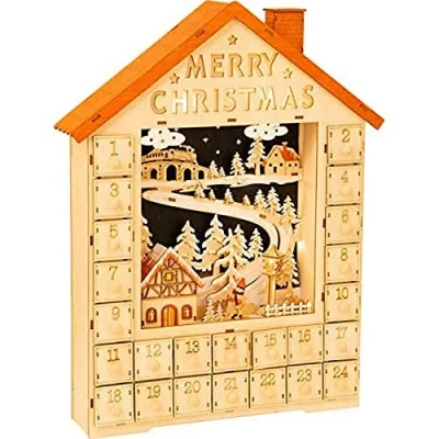 The small wooden drawers are secured by a small stopper from falling out. The advent calendar is made of filigree wood, decorated in detail and has indirect, battery-operated lighting. The advent calendar can be reused and individually filled every year.