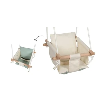 The stylish babies’ swing with untreated wood and a reversible textile cushion ensures safe and gentle swinging The removable reversible cushion with its modern muted colours provides soft seating comfort in each development phase Four stable antiroll bars, height-adjustable ropes and a length-adjustable strap guarantee safety and an individually adjustable swing height The babies’ swing provides comfortable seating and simultaneously promotes the development of movement and sense of balance in small children. Rope length approx. 144 cm, swing approx. 33 x 33 x 58 cm, max. load-bearing capacity 60 kg, Manufacturer: small foot