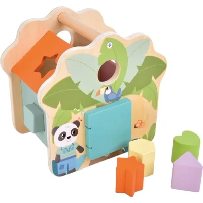 High-quality wooden building blocks with cute jungle motifs and exotic palm tree illustration Child-friendly building blocks in the shape of a house with five rounded blocks in different colours and shapes Placing the wooden pieces in the correct openings is a fun way to learn about colours and shapes and develop fine motor skills The roof with integrated handle makes it easy to carry the wooden toy, making it the ideal companion for on the go Approx. 18 x 12 x 17 cm, Manufacturer: small foot
