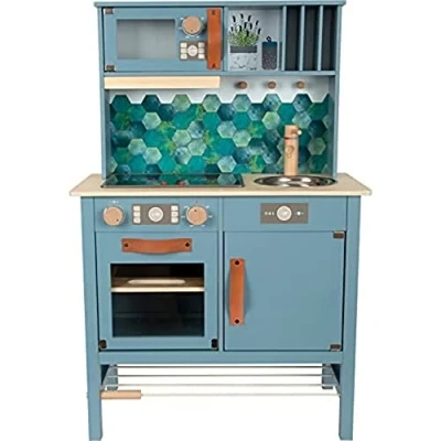 With plenty of accessories including a pot, pan, and kitchen utensils so that the "cooking" can start right away Authentic play with the realistic clicking sounds of the turnable knobs, an extendable exhaust hood with a light indicator, and the electronic range with light & sound effects Visual eye-catchers like the flippable rear wall (plain/tile look) and the surfaces printed with kitchen details in the refrigerator and oven round out the overall look Children develop their social skills when role-playing Goes together perfectly with the colour-coordinated kitchen appliances of the 'tasty" product series, Manufacturer: small foot