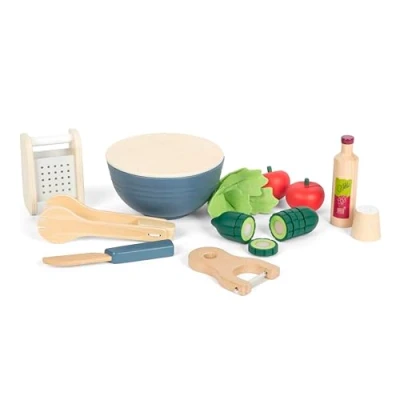 Cuttable salad play set with a modern design and made of high-quality wood Incl. realistic vegetable grater, salad tongs, dressing/olive oil bottle, salt shaker, and vegetable peeler Introduces children to a healthy diet and how to prepare fresh meals Trains everyday kitchen skills in a fun way Bowl: approx. 15 x 15 x 8 cm, Manufacturer: small foot