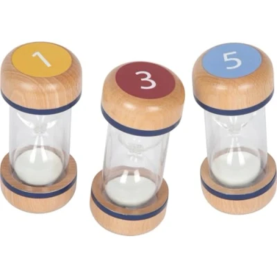 The high-quality set consists of three differently coloured hourglasses with 1, 3 and 5 minute running times. The hourglasses offer preschool and primary school children a clear aid for orienting themselves in relation to time. The educational toy supports children in everyday situations such as brushing their teeth, doing their homework or playing, and promotes structure and self-organisation. The robust plastic hourglasses with sturdy beech wood frames are child-friendly in size and fit well in small hands. Length: approx. 14 cm, Ø approx. 6 cm, Manufacturer: small foot