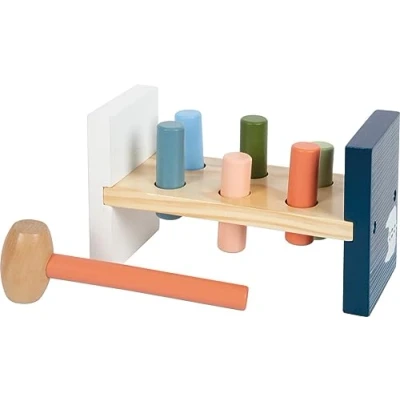 A hammering bench made of FSC 100%-certified wood in an arctic look Rubber-lined holes hold the 6 wooden cylinders in place Comes with a robust hammer that's easy for children's hands to hold Once all the cylinders have been hammered through, the toy can simply be flipped over so the fun can start all over again. Approx.22 x 9 x 12 cm, Manufacturer: small foot