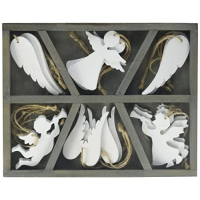 Decoration hanger angel made of white painted wood Thus every room can be adorned adventitiously Properly the hangers can be stowed in the intended wooden box In various, beautiful forms Spread Christmas spirit.
